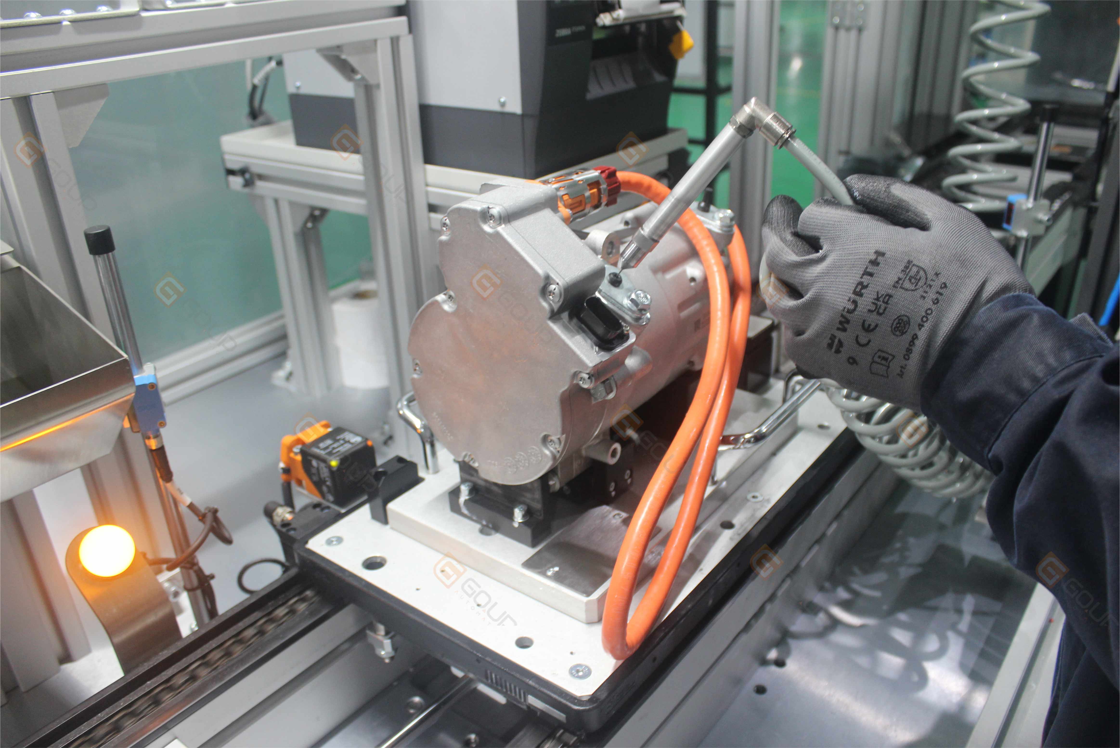 圖為高品同事正在為電動(dòng)壓縮機(jī)核心氦檢測(cè)工位設(shè)備調(diào)試